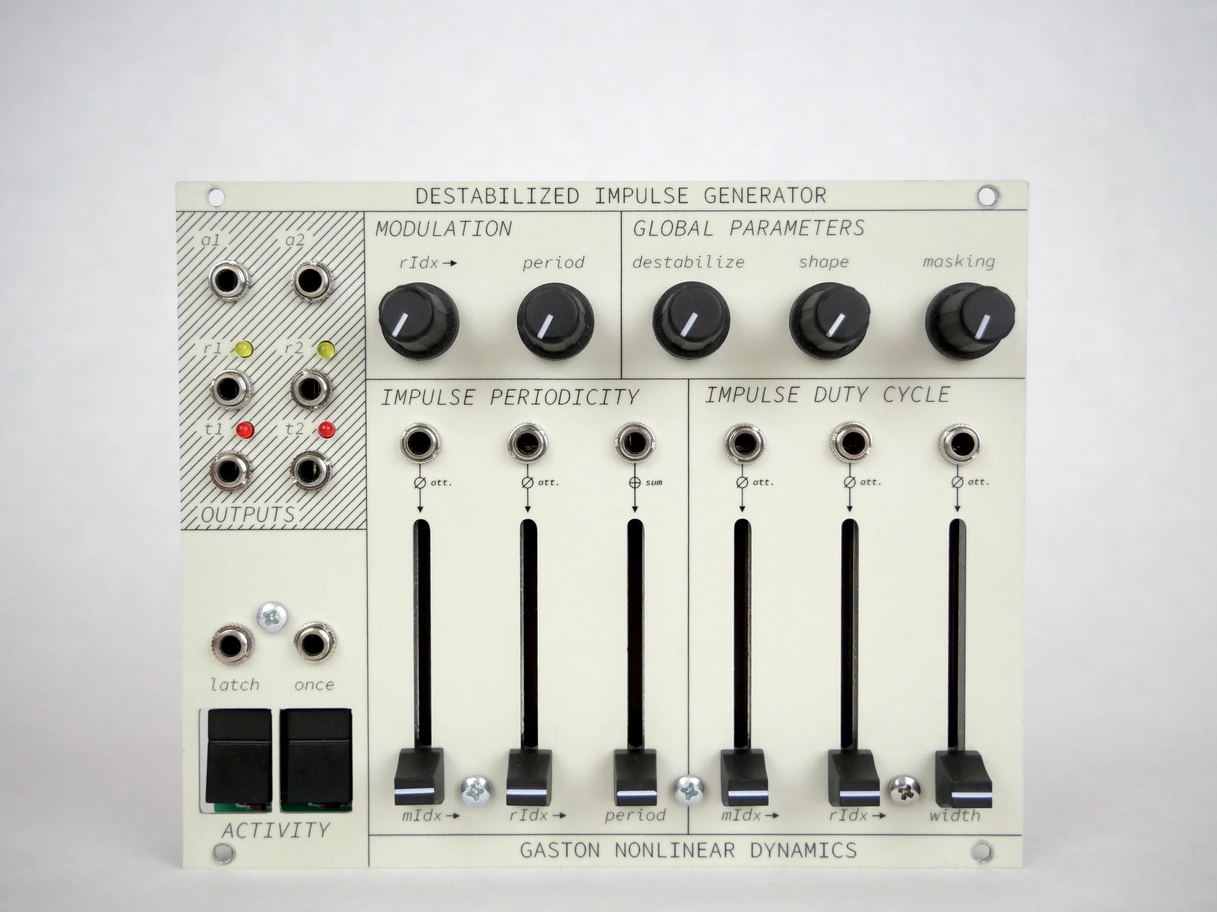 Destabilized Impulse Generator is a concept/prototype module for the [Nonlinear] Dynamics system. It is now considered obsolete—its core functionality is replicated and extended in the more recent Compact Impulse Generator. As of May 2025, only two Destabilized Impulse Generators have been built; nonetheless, it marks a significant milestone in developing the [Nonlinear] Dynamics system.